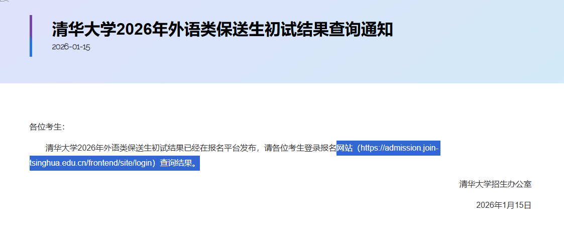 清华大学2026年外语类保送生初试结果已经在报名平台发布,请各位考生登录报名网站(https://admission.join-tsinghua.edu.cn/frontend/site/login)查询结果。