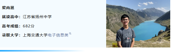 2026年强基计划备战已经开始!有哪些备考经验可以进行参考借鉴?今天为大家分享来自江苏省扬州中学梁尚恩同学的上交大高考备考经验。他高一时成绩不稳定,语文成绩甚至只有两位数;在不懈的努力下,他高考语文考了129分,提升了近30分,最终以高考682分考入上海交通大学!一起来看他是怎么学的!