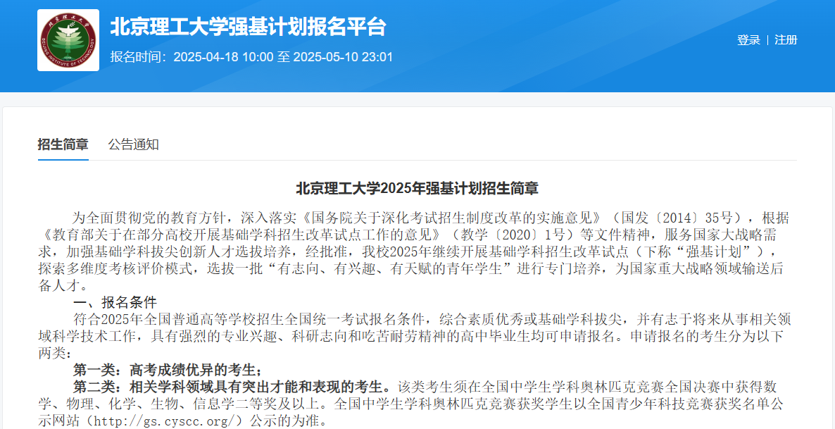 注意报名时间:北理工强基计划的报名时间通常较为短暂,考生需密切关注学校官网或其他官方渠道发布的报名时间,避免因错过报名时间而失去报考机会。