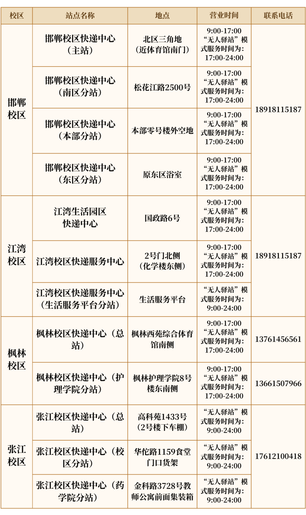 所有站点转为无人驿站服务模式,有问题或特殊情况可致电联系: