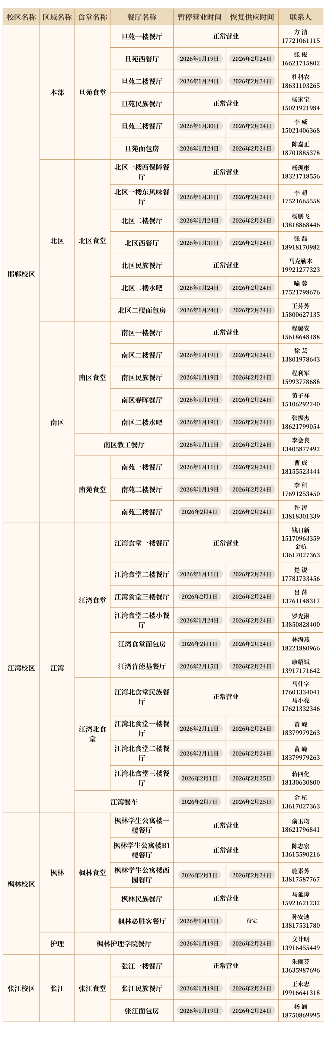 2.寒假部分餐厅涉及安全性修缮,营业时间如有变动,会提前现场告知,请师生以现场通知为准。
