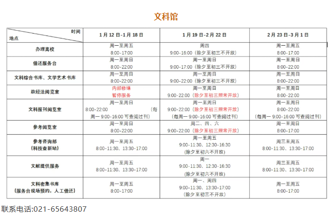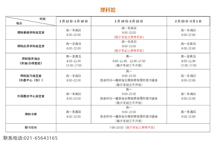 寒假期间,各馆具体开放时间请见附表所示。若在相关阅览室关闭期间需要使用其中书刊资料,请提前和值班老师联系。