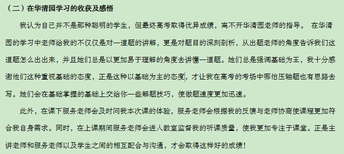学习感受:高二寒假开始学习数学课程,听了几节课后,我茅塞顿开知道了数学的用力点所在,提高了自己的分析能力。学完数学,紧接着又报了物理、化学、语文三科,当班上其他同学还在对难题一筹莫展时,我早在华清园学会了分析和探究题目,有了更高层次的解题思维。