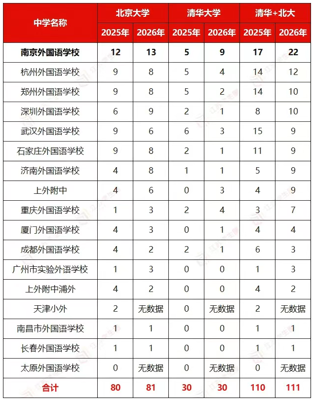 1月19日,省内top0高中南京外国语学校发布了2026届清北外语类保送录取结果,北京大学录取13人,占录取总人数16%;清华大学录取9人,占录取总人数30%,以绝对优势领跑全国,自主选拔在线恭喜南外学子,一起来看保送生录取名单。