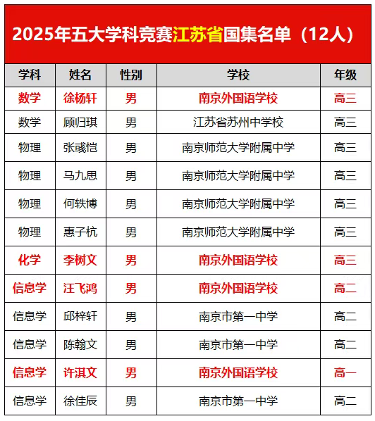 2025年五大学科竞赛中,南外1名数学竞赛生入选国家集训队,1名化学竞赛生入选国家集训队,2名信息学竞赛生入选国家集训队,共计4人获得清北保送资格,竞赛实力在江苏省与南师附中与苏州中学同属竞赛第一档。