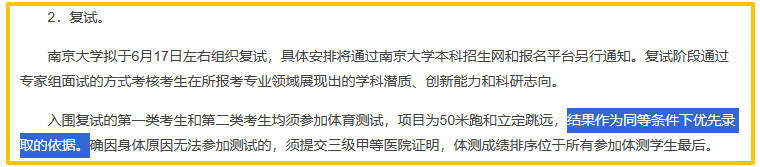 南京大学强基计划入围复试的第一类考生和第二类考生均须参加体育测试,项目为50米跑和立定跳远,那么,南大强基计划录取会参考体育成绩吗?如果不参加会有什么影响?