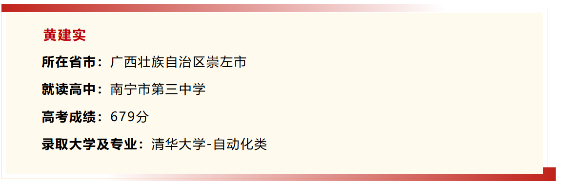 我是来自广西崇左市大新县的黄建实,高中就读于南宁市第三中学。在这个高手云集、学习氛围浓厚的学府里,在老师指导和同学互助下,我平时模拟考成绩优异,高三时稳定在660分左右,年级排名前二十名,曾几次进入年级前十名。