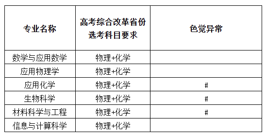 2.对考生身体健康状况的要求执行教育部、原卫生部、中国残疾人联合会制定并下发的《普通高等学校招生体检工作指导意见》中的规定。标记“#”的专业不招收相关色觉异常(色盲、色弱、单色不能识别)考生。