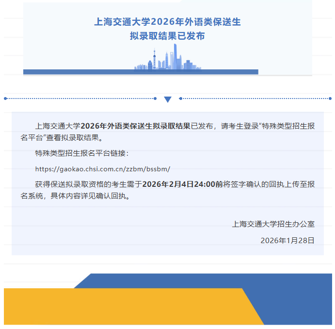 上海交通大学2026年外语类保送生拟录取结果已发布,请考生登录“特殊类型招生报名平台”查看拟录取结果。