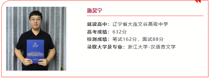 2026年强基计划备战已经开始!有哪些备考经验可以进行参考借鉴?今天为大家分享来自辽宁省大连文谷高级中学施同学的学习经验,他平时成绩省排200名以内,对古典文学非常感兴趣,后来通过特招升学规划与强基校测备考,他成功以高考632分上岸浙江大学强基计划!一起来看他的强基校测备考经验有哪些方面值得借鉴 !