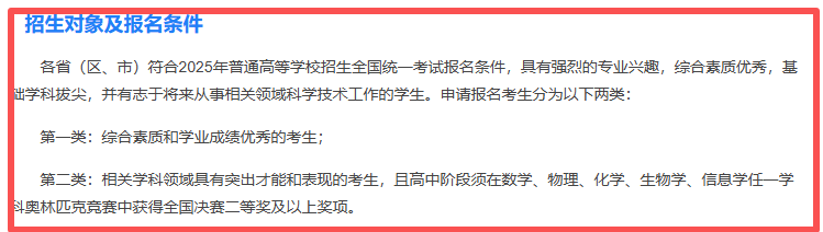 这类考生是为在相关学科领域具有突出才能和表现的“偏才怪才”设置的,要求在高中阶段的数学、物理、化学、生物学、信息学奥林匹克竞赛中获得全国决赛二等奖及以上奖项。这类考生享有破格入围复试的资格。