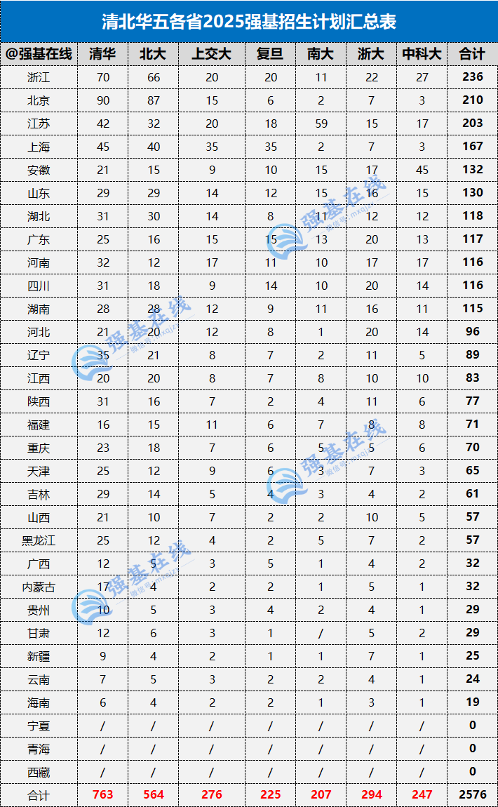距离2026年强基计划报名还有2个多月的时间,想精准定位目标院校,光看高考分数远远不够,必须结合本省招生人数来判断竞争激烈程度。为此,我们汇总了清华、北大、上交、复旦等7所名校2025年强基Ⅰ类考生的分省招生人数,为各位家长考生的报考策略提供数据参考。