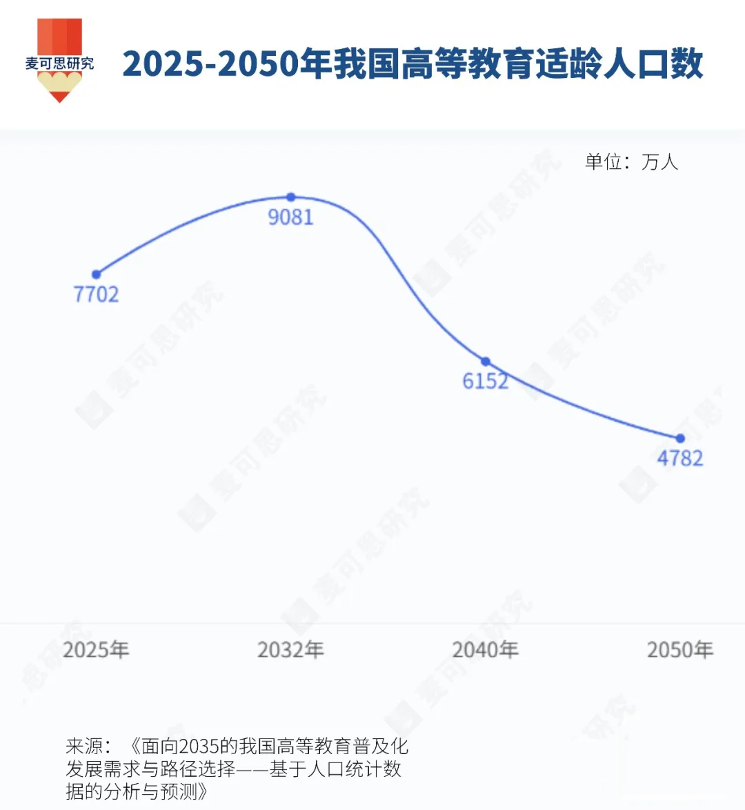 厦门大学教育研究院院长别敦荣在相关会议报告中提到,全国高等教育适龄人口将在2035年达到9000万左右的峰值。此后该数据会持续下降,到2042年左右将稳定在5000万上下。