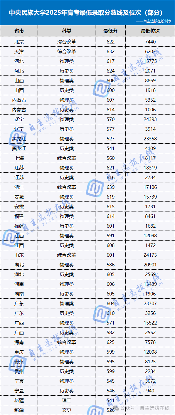 通常来说,强基入围分数线会低于高考统招分数线5-35分不等,自主选拔在线为大家汇总整理了中央民族大学2025各省市高考最低投档分数线,供各位考生家长对照参考。