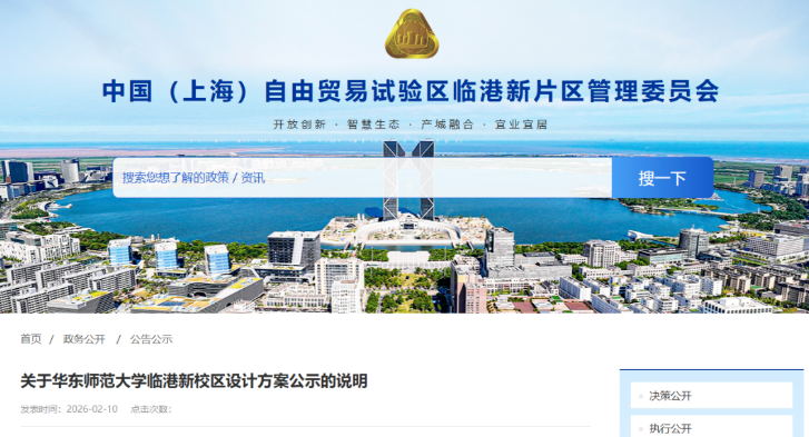 2026年2月10日,中国(上海)自由贸易试验区临港新片区管理委员会发布《关于华东师范大学临港新校区设计方案公示的说明》,这意味着华东师范大学在闵行、普陀两大校区之外,即将迎来临港新校区,该校“一校两区”的办学格局将升级为“一校三区”。