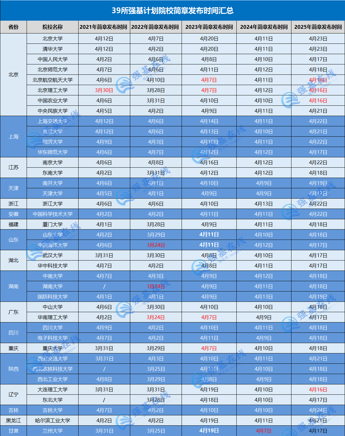 39所高校的强基计划招生简章一般在每年的3月底至4月初公布,2025年强基招生简章发布时间较晚,2026年预计也将于同期公布。我们特为大家整理了2021-2025年各高校强基计划招生简章公布时间,可供大家参考!