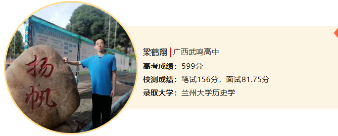 2026年强基计划备战已经开始!有哪些备考经验可以进行参考借鉴?今天为大家分享,来自广西武鸣高中的梁同学强基上岸经验。他在高中成绩一直是中游水平,高一开始接触强基计划,在准备综合素质材料过程中,参加了燕园杯获得省奖,后在华清园中跟随教授老师进行历史论文写作,历史成绩和个人素质得到了很大提升,最终以高考成绩599分,笔试成绩156分,面试成绩81.75分上岸兰州大学历史学专业。高一到高三,他是如何规划特招之路?有哪些学习心得和特招备考经验可以参考?如何做好针对性的准备?一起来看他的经验分享!