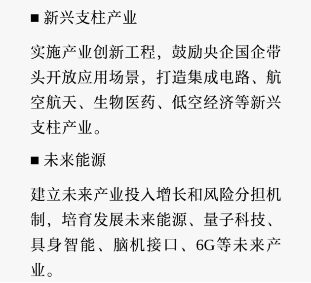 2026年政府工作报告指出:鼓励央企国企带头开放应用场景,打造集成电路、航空航天、生物医药、低空经济等新兴支柱产业。建立未来产业投入增长和风险分担机制,培育发展未来能源、量子科技、具身智能、脑机接口、6G等未来产业。