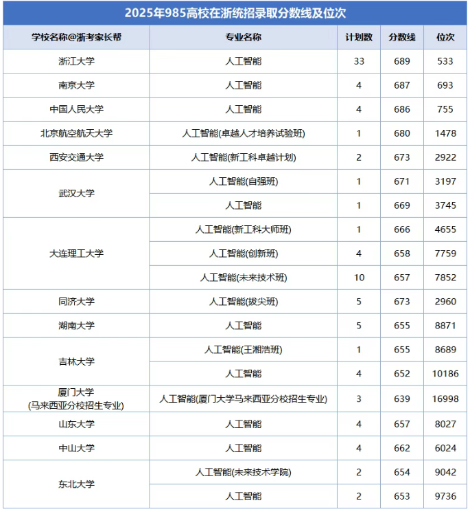 2025年985院校人工智能专业在浙江招录数据(部分):