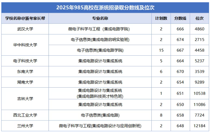2025年985院校集成电路专业在浙江招录数据(部分):