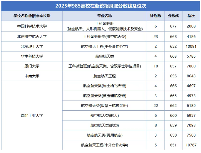 2025年985院校航空航天专业在浙江招录数据(部分):