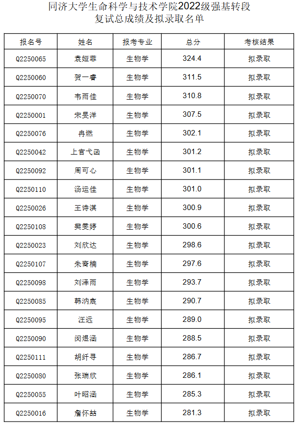 同济大学生命科学与技术学院2022级强基转段复试总成绩及拟录取名单出炉,据学校官方显示,此次共计有22人通过复试,正式进入拟录取行列,接下来一起来看同济大学相关转段名单信息!