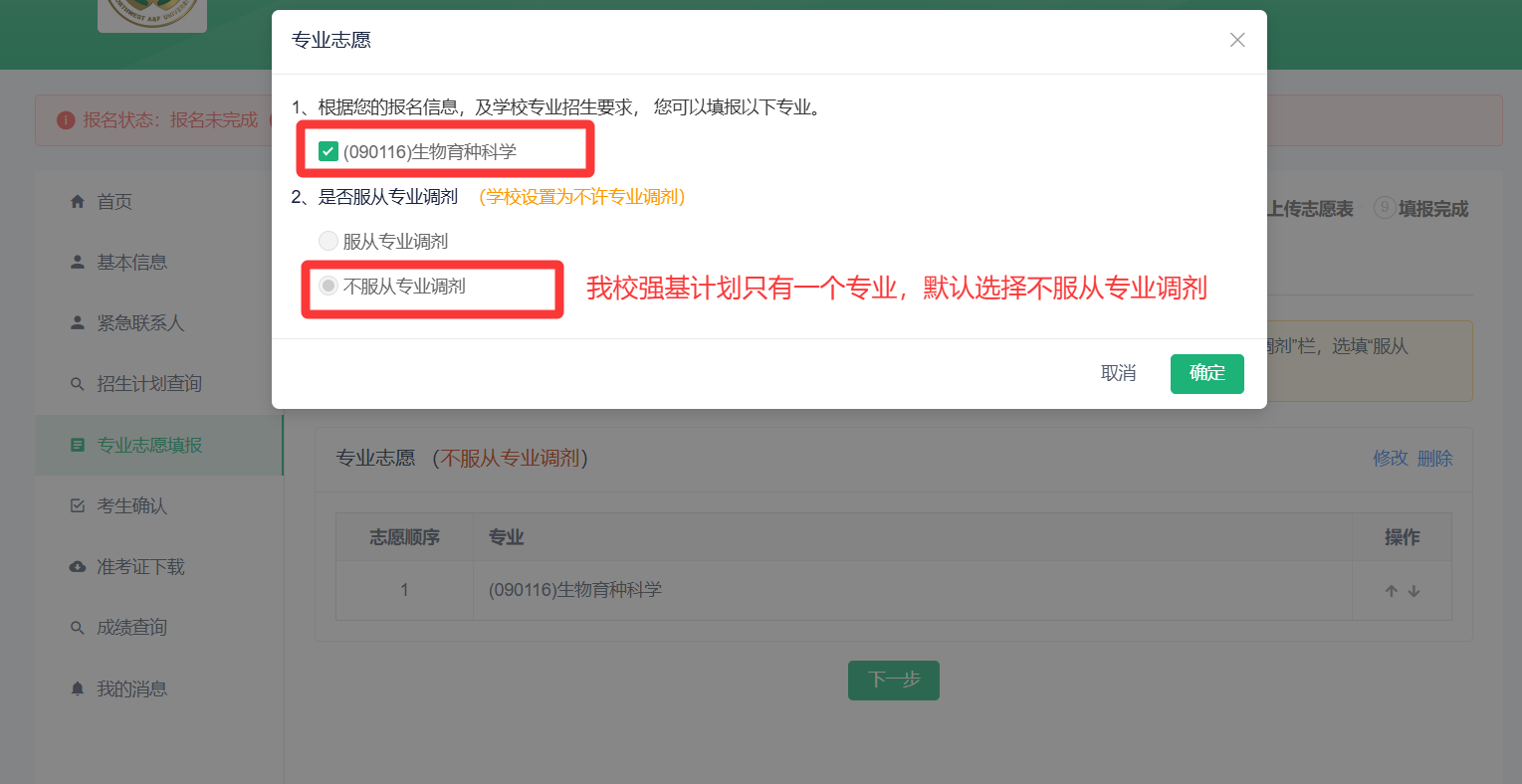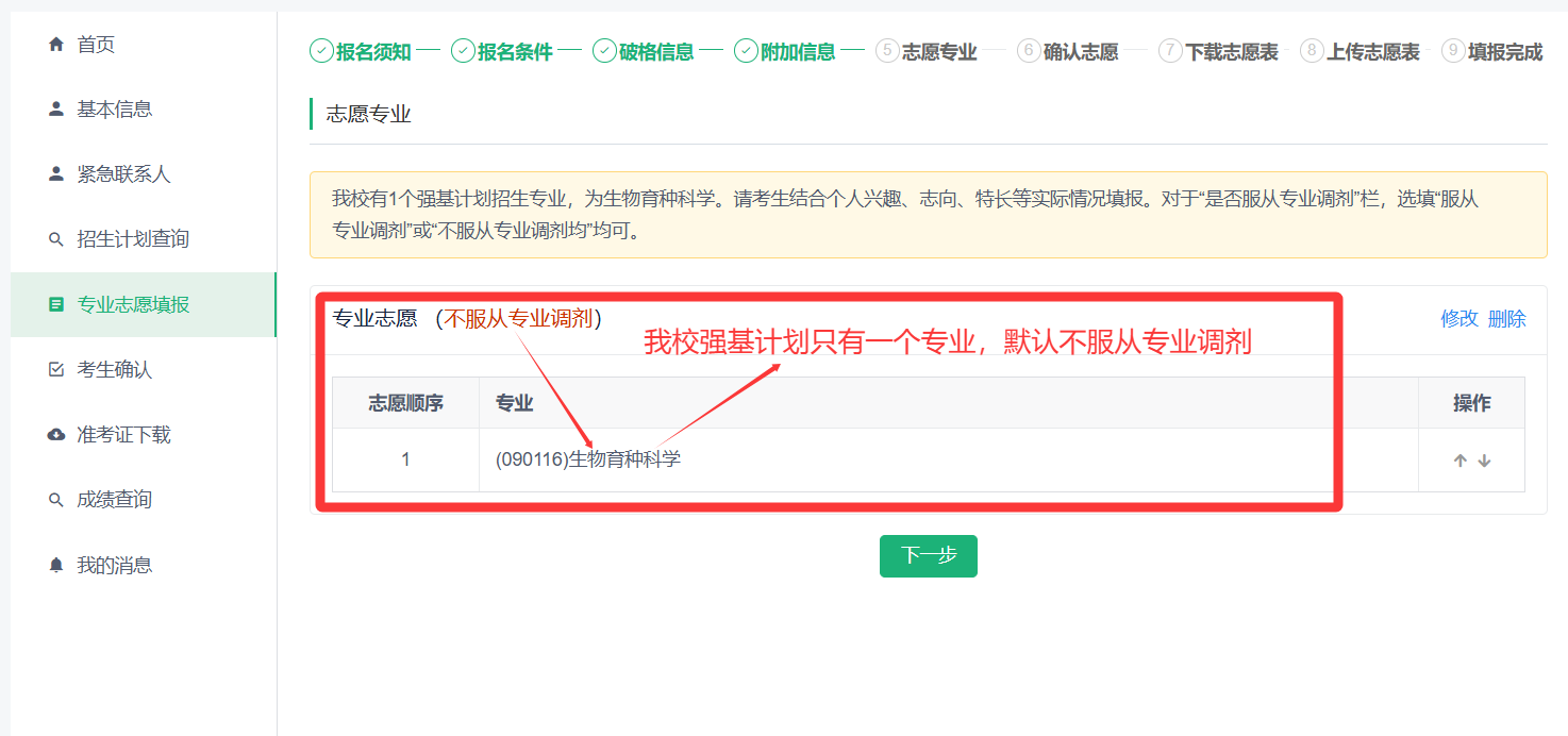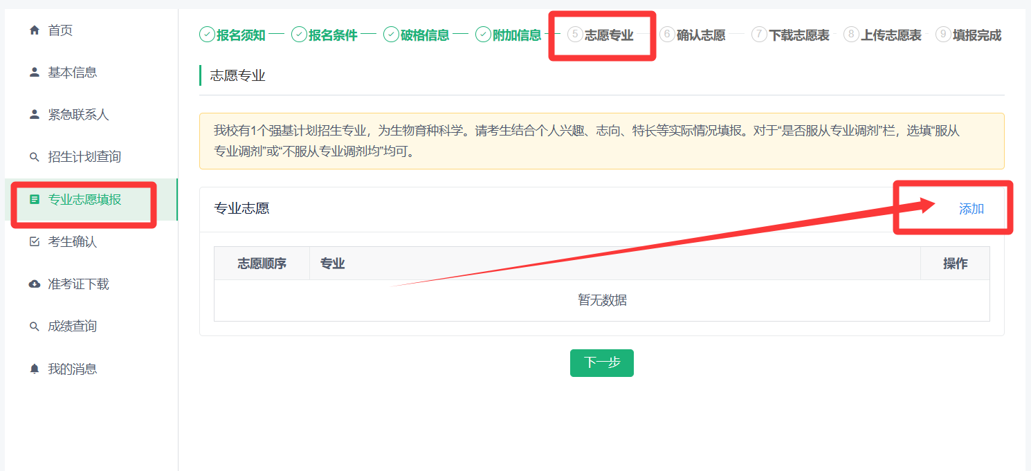 (3)点击【添加】填报志愿信息,我校强基计划只有一个专业,故默认不服从专业调剂。