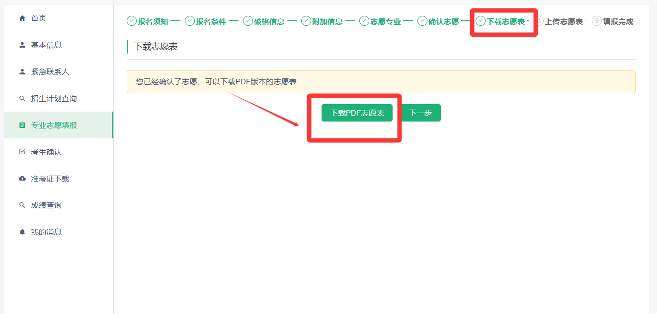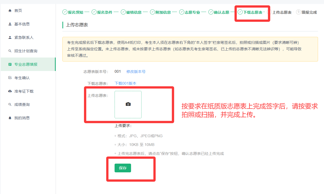 (4)确认志愿后,请点击下载PDF志愿表。注意,使用A4纸打印。打印完成后,须在志愿表右下角“考生本人签名”处,以手写方式签署本人姓名。完成签名后,考生应通过拍照或扫描的方式,将志愿表制作成清晰、完整的电子图片,并上传至指定位置。上传的志愿表图片须确保内容清晰可辨,且为考生本人所填报的志愿表。若未按照上述要求完成志愿表上传工作,有可能会影响材料的审核。