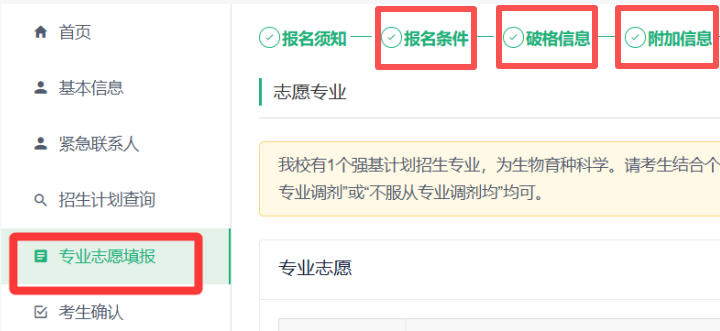 (2)【报名条件】【破格信息】【附加信息】请按照提示依次填报。