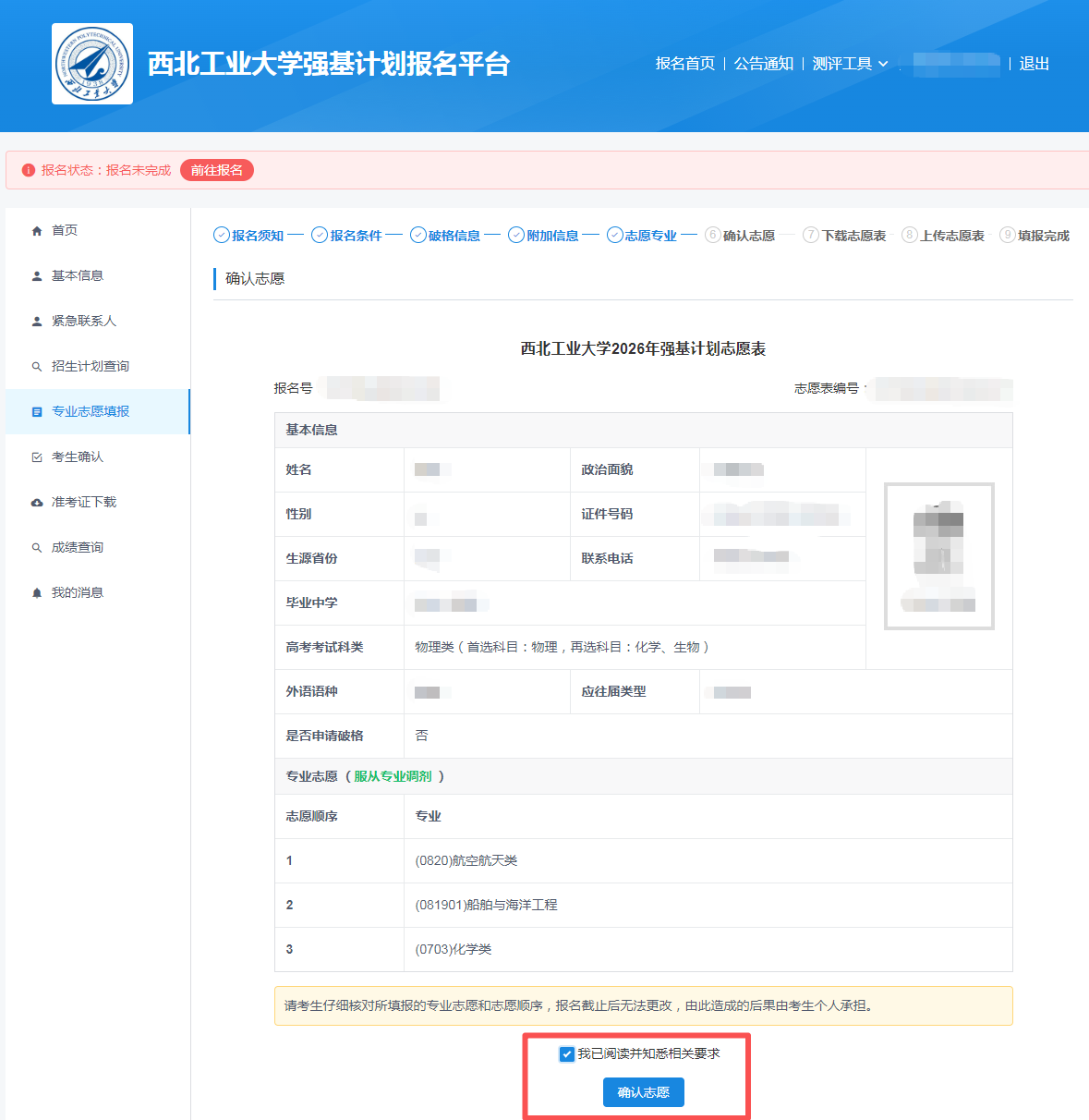 考生仔细核对个人信息和报考的专业志愿,确认无误后勾选我已阅读并知悉相关要求,并点击确认志愿。