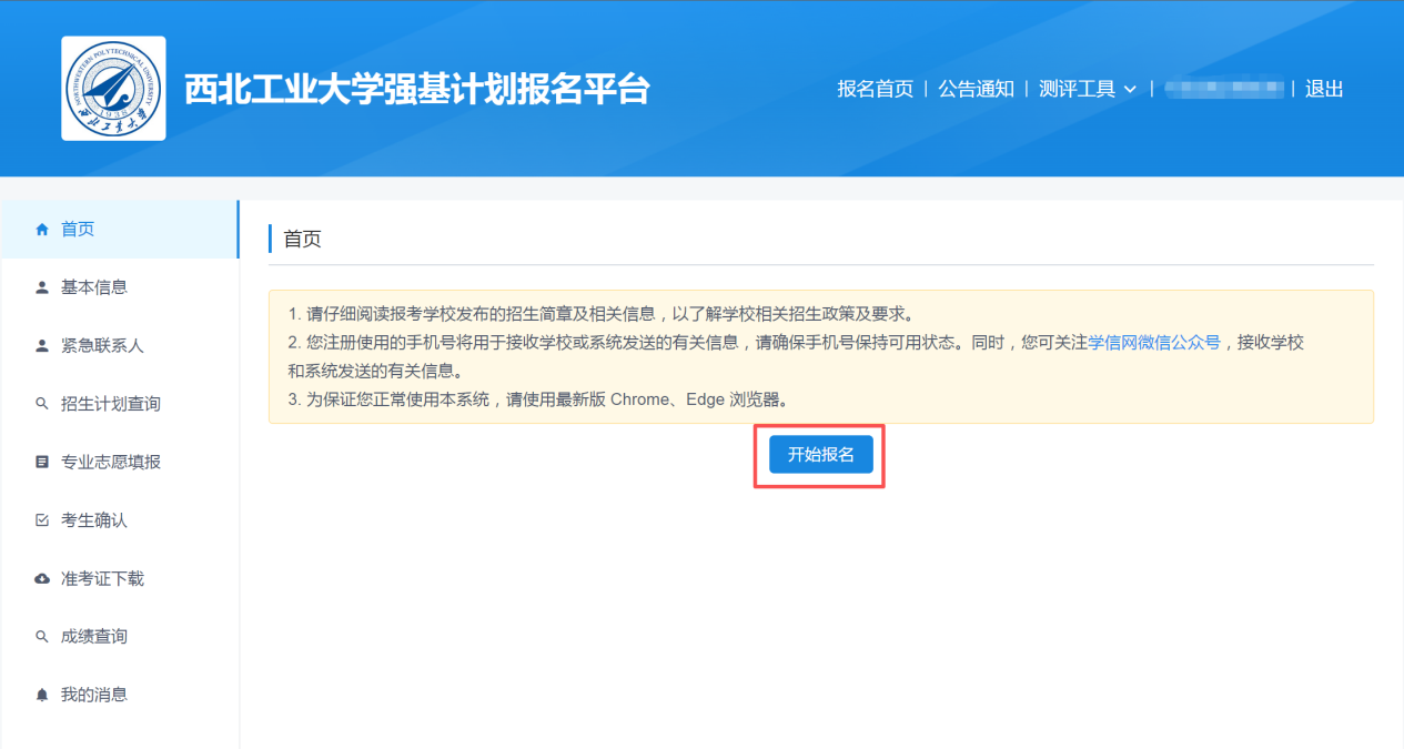 登录西北工业大学强基计划报名平台(网址:https://bm.chsi.com.cn/jcxkzs/sch/10699),用学信网账号登录系统。