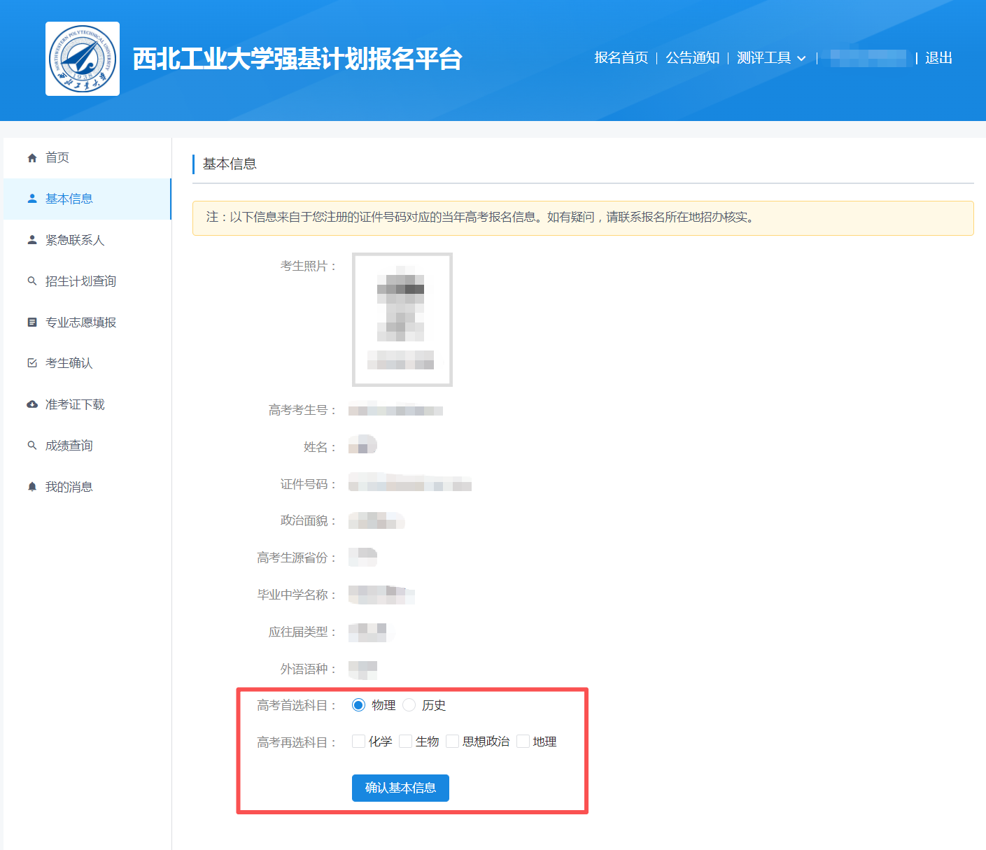 点击开始报名,并核对个人信息。考生须对高考报名信息进行核对,并勾选选考科目,确认无误后点击确认基本信息。