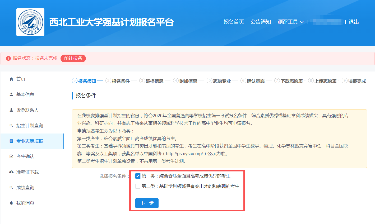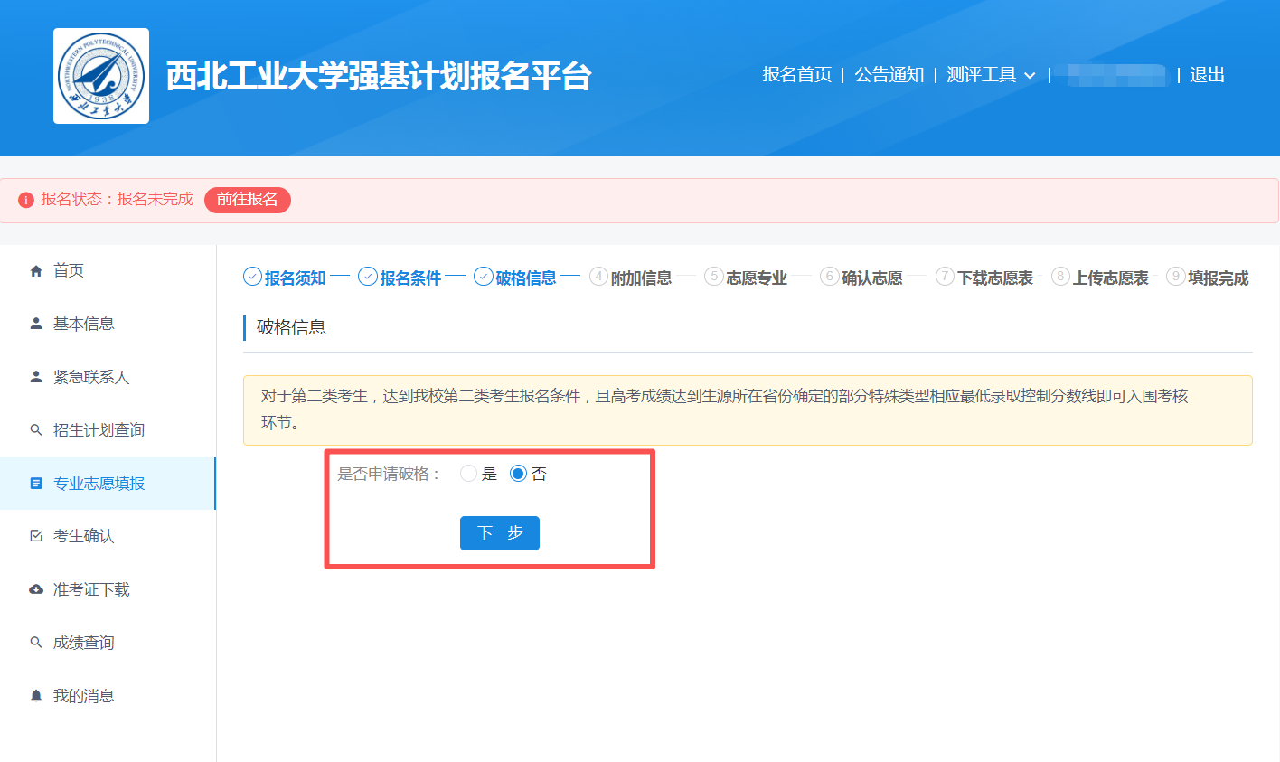 根据简章要求选择报名条件,并点击下一步。第一类考生选择不申请破格,第二类考生需选择申请破格。