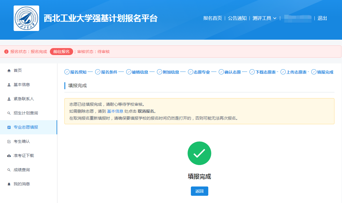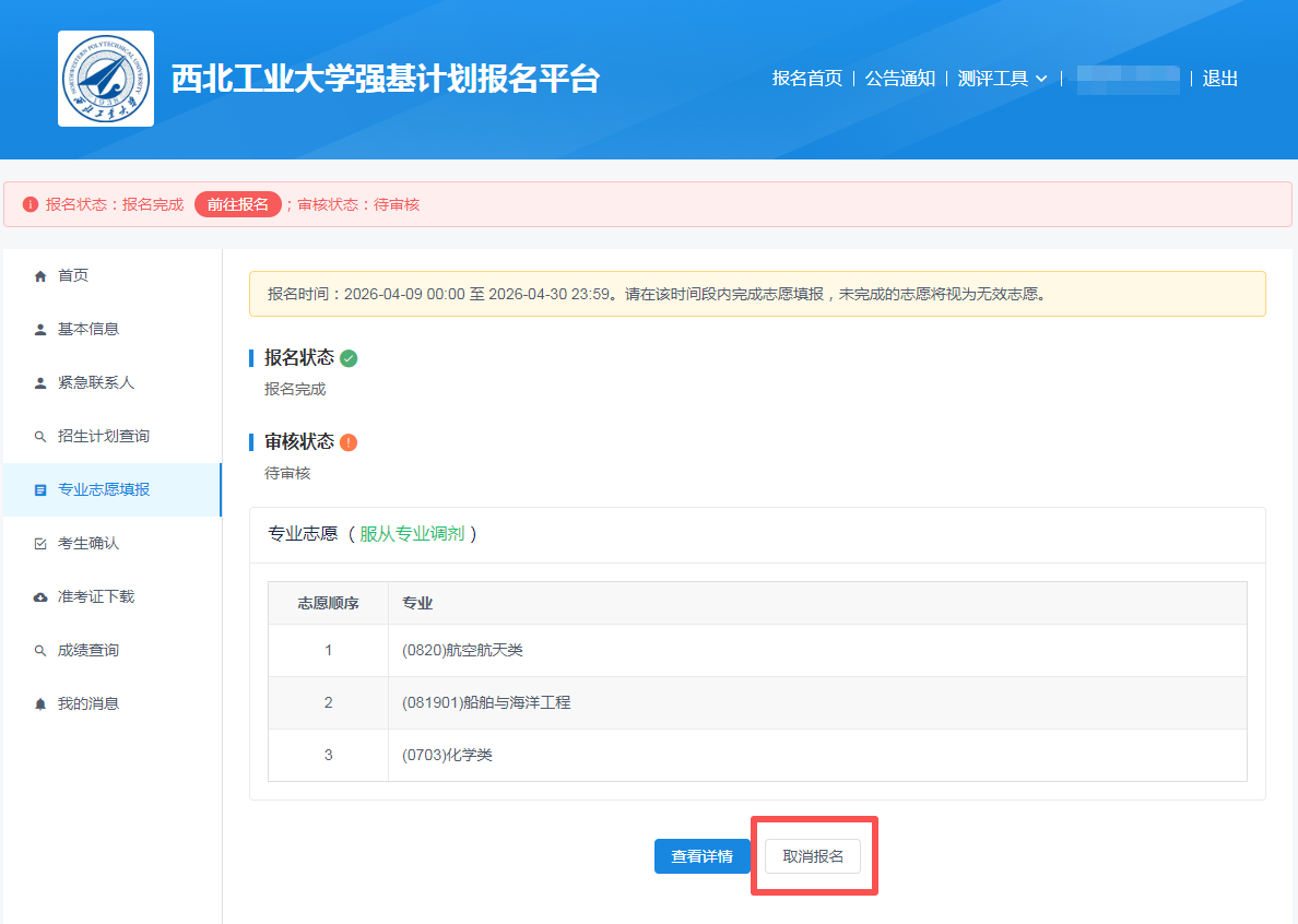 填报完成后,考生可以在专业志愿填报页面查看已经填报的志愿,如果希望更改志愿,在4月30日报名截止前取消报名重新填报即可。