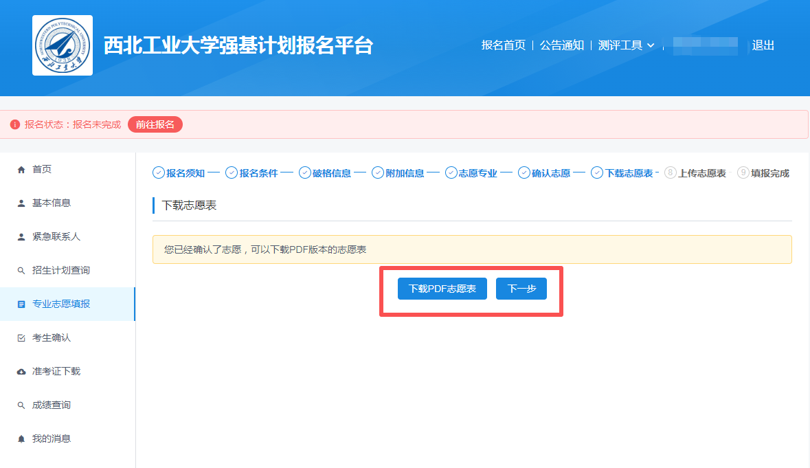 点击下载PDF志愿表,确认填报信息无误后打印签字,并扫描成图片格式。