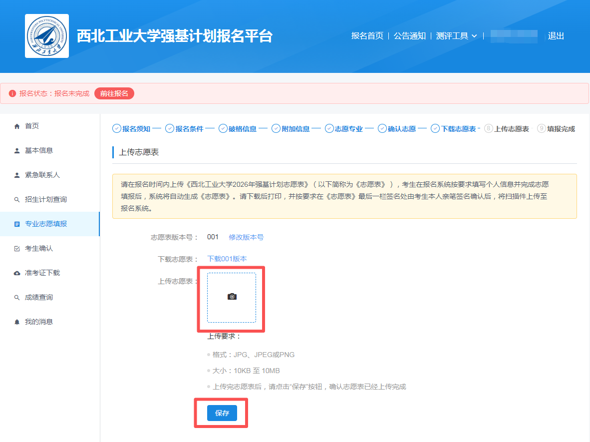 上传签字确认后的志愿表扫描件,并点击保存。