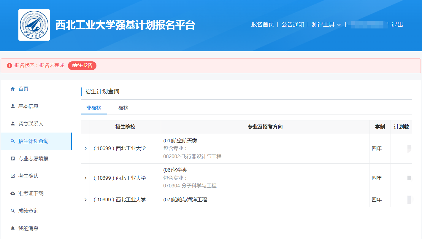 在填报志愿前,考生可点击左侧列表的招生计划查询,查看我校在考生所在省份的强基计划招生专业和招生计划数。