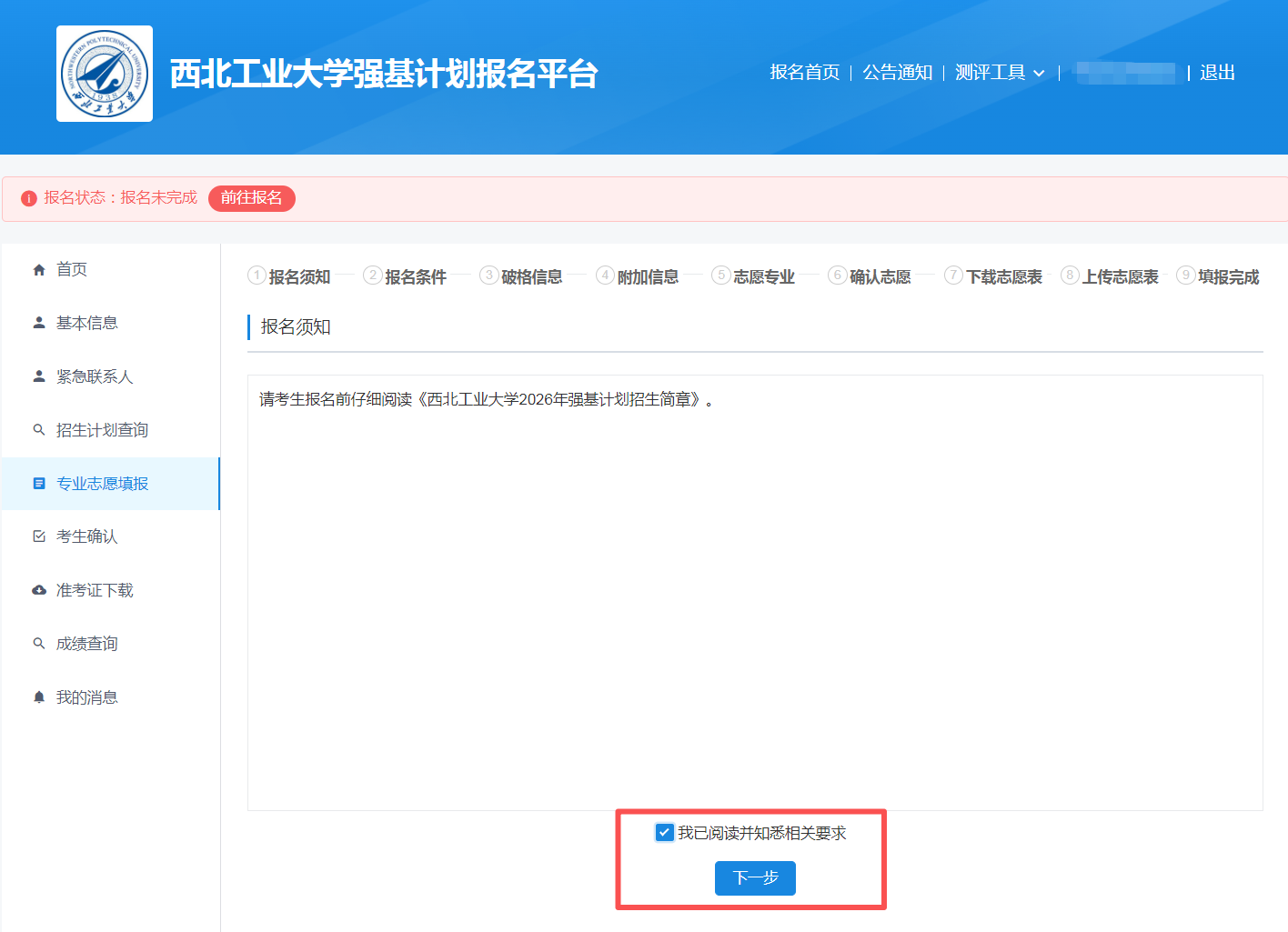 在专业志愿填报页面点击开始报名,仔细阅读招生简章并点击下一步。