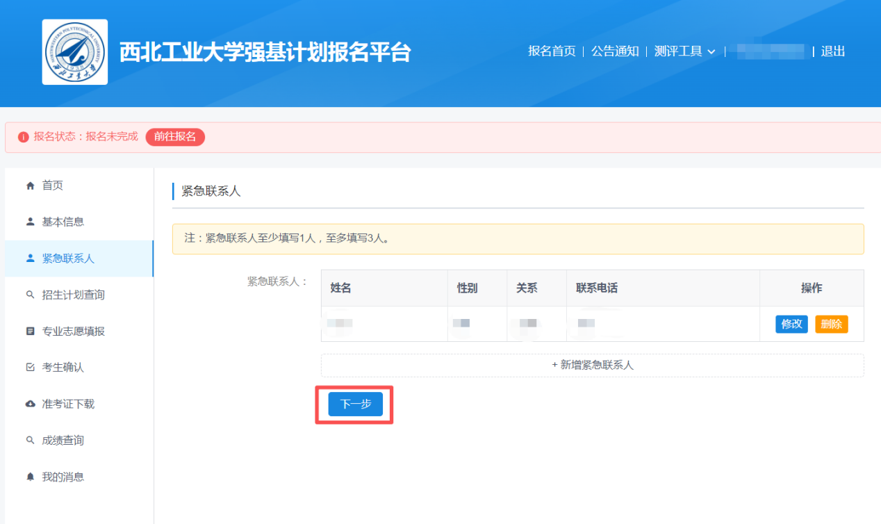 根据报名平台提示添加父母或其他紧急联系人姓名和联系电话。