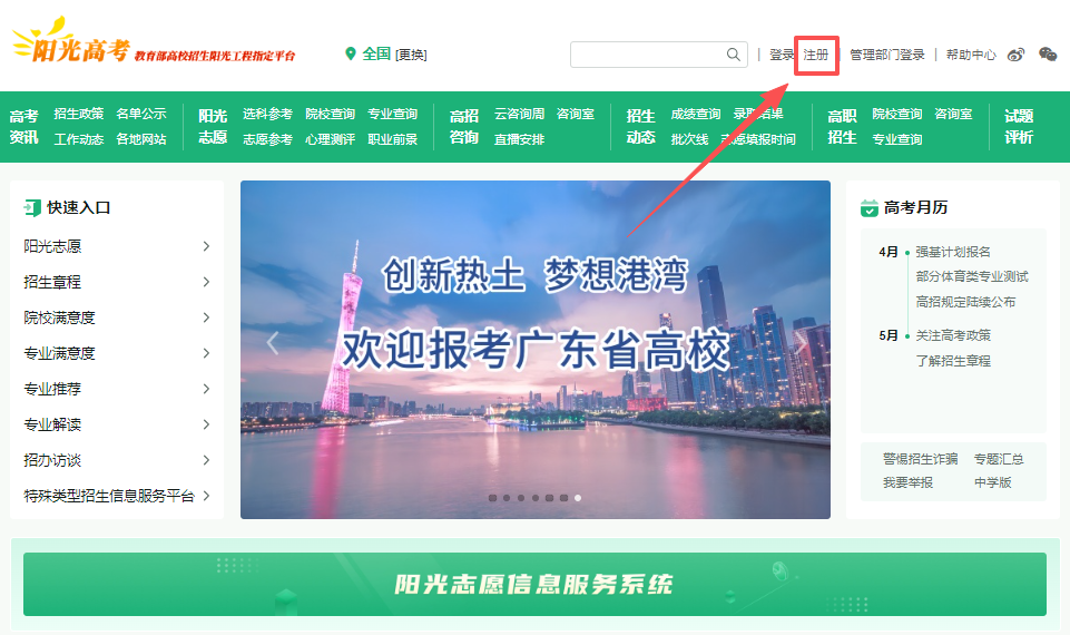 考生首次登陆阳光高考平台报名系统时,需要先进行账号注册,注册成功后才能成功登陆(点击报名系统界面的右上角进行注册)
