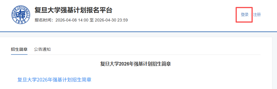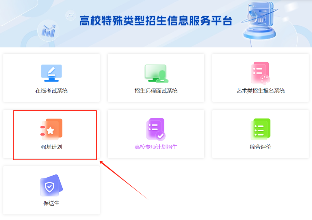 完成上面注册步骤,登录账号后,考生可点击首页“特殊类型招生信息服务平台”或“特殊类型招生报名”后,选择“强基计划”对应的报名入口进入。