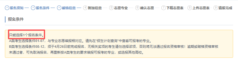 B类考生选择条件08-12,须于4月26日前完成报名,无相关奖项的考生请勿选择该项,否则将无法通过报名资格审核!逾期或破格资格审核未通过者,可先取消报名,再重新按A类考生的要求填报可报考的专业,或选报其他高校。