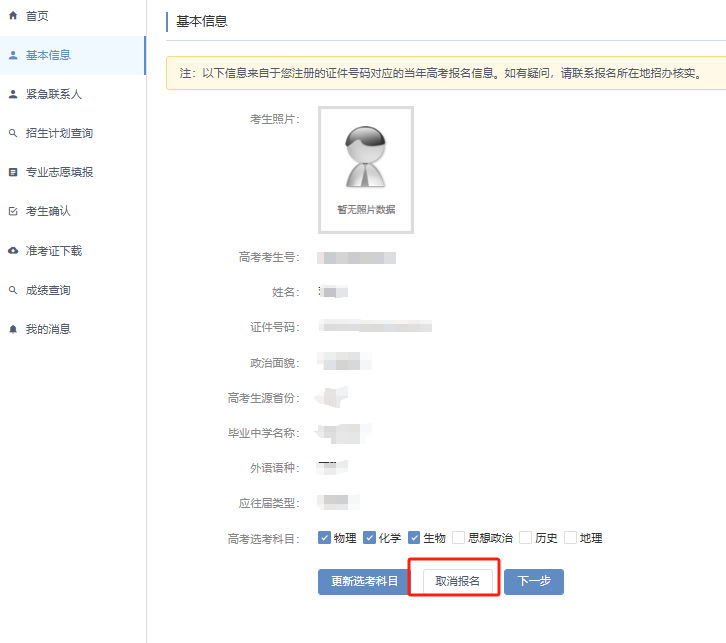 以下信息来自于您注册的证件号码对应的当年高考报名信息。如有疑问,请联系报名所在地招办核实。