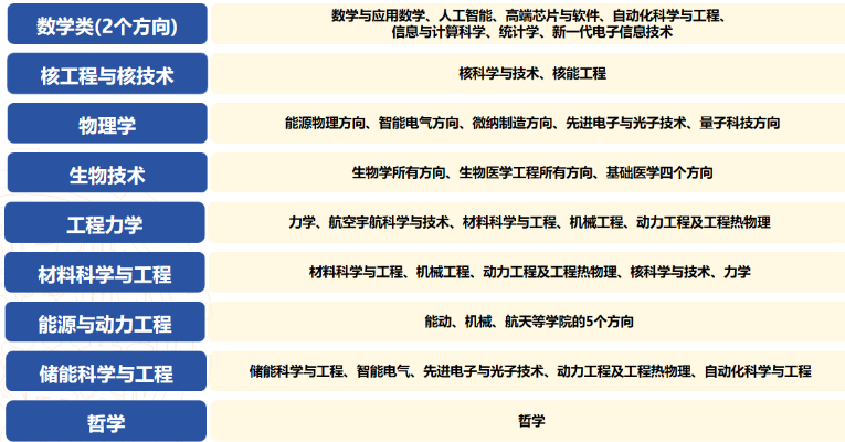 数学类(包含:数学与应用数学、信息与技术科学两个专业)、物理学、生物技术、核工程与核技术、工程力学、材料科学与工程、能源与动力工程、哲学,以及2026年新增的储能科学与工程专业。