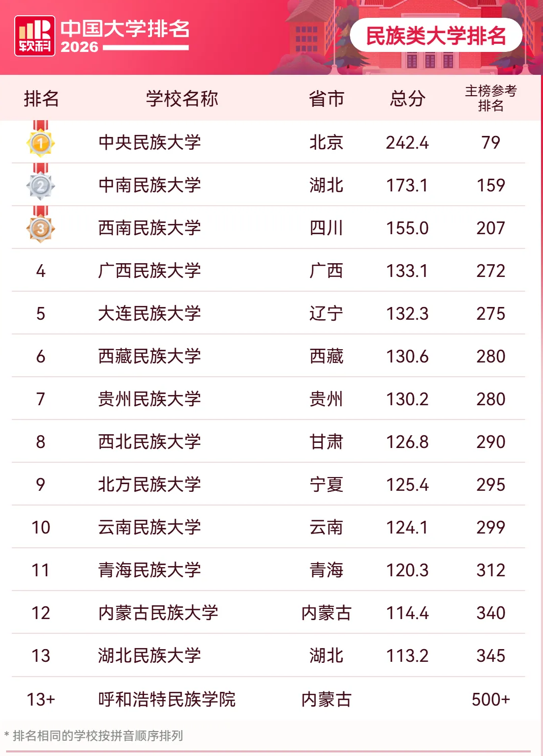 2026年软科中国大学排名最新发布!本期我们聚焦民族类高校,一起来看看今年的排名情况。自主选拔在线团队已为您整理完毕,快来一探究竟吧!