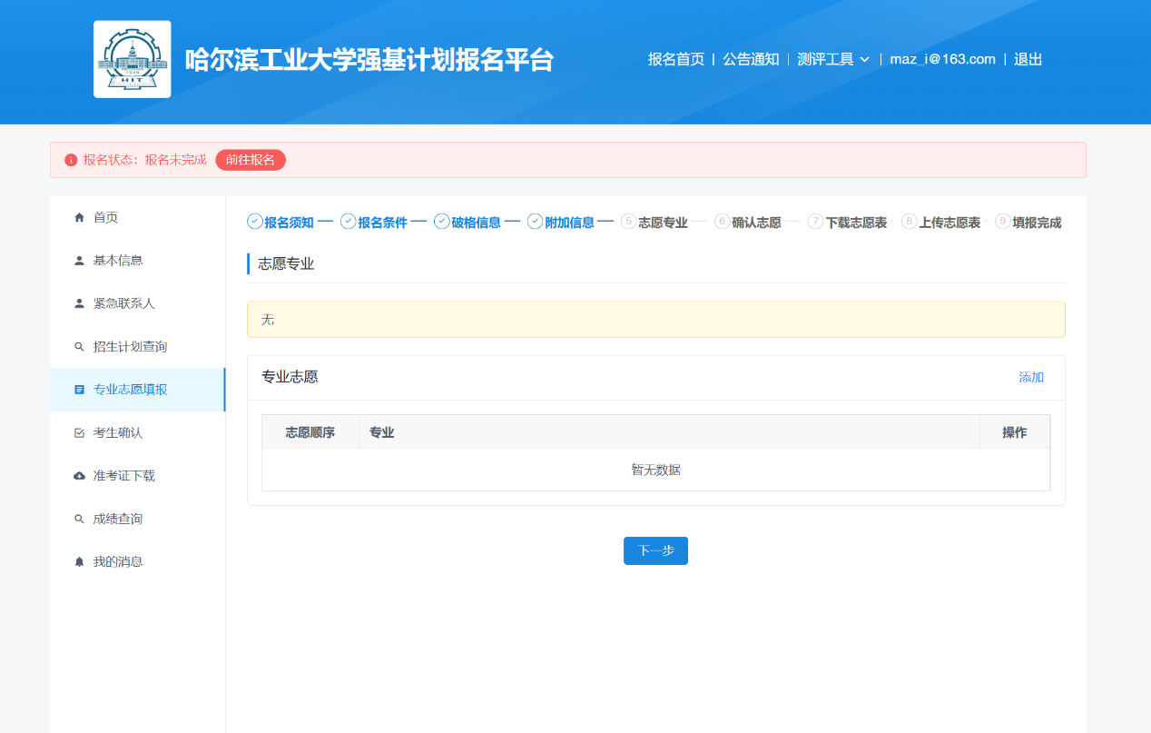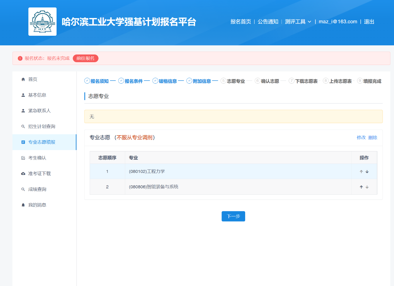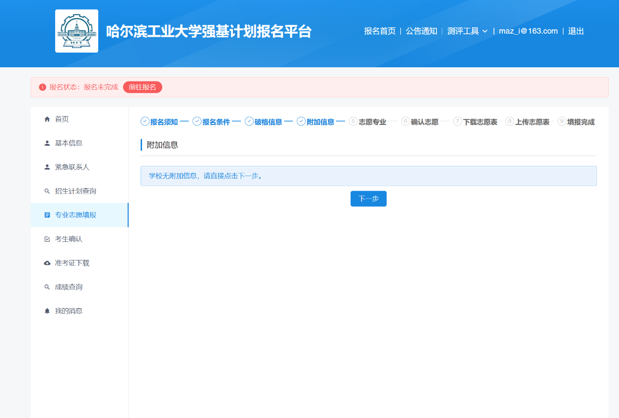 成功登录系统后,可以看到网页左侧有基本信息、紧急联系人等多个环节,在强基计划报名阶段只需到专业志愿填报环节即可。