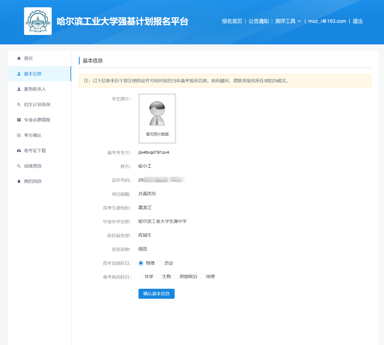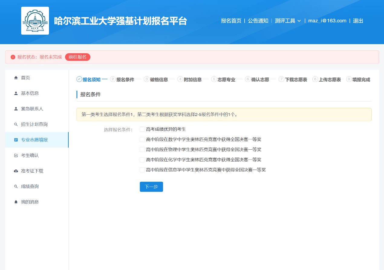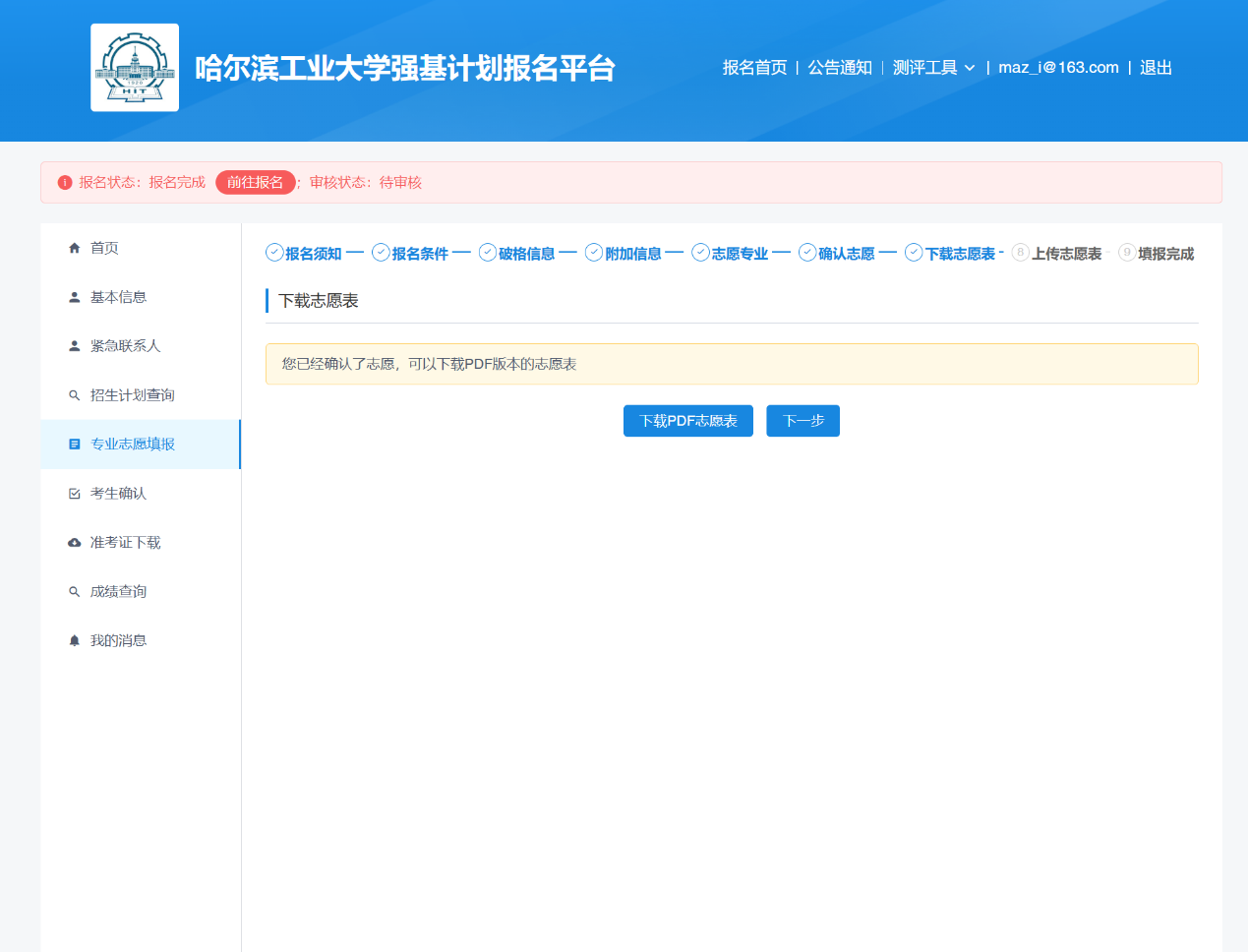 成功登录系统后,可以看到网页左侧有基本信息、紧急联系人等多个环节,在强基计划报名阶段只需到专业志愿填报环节即可。