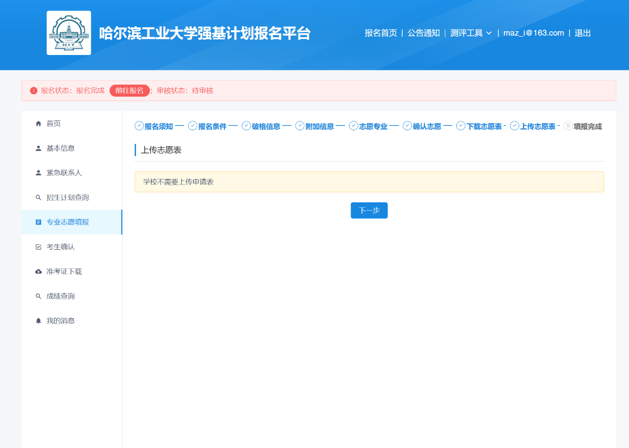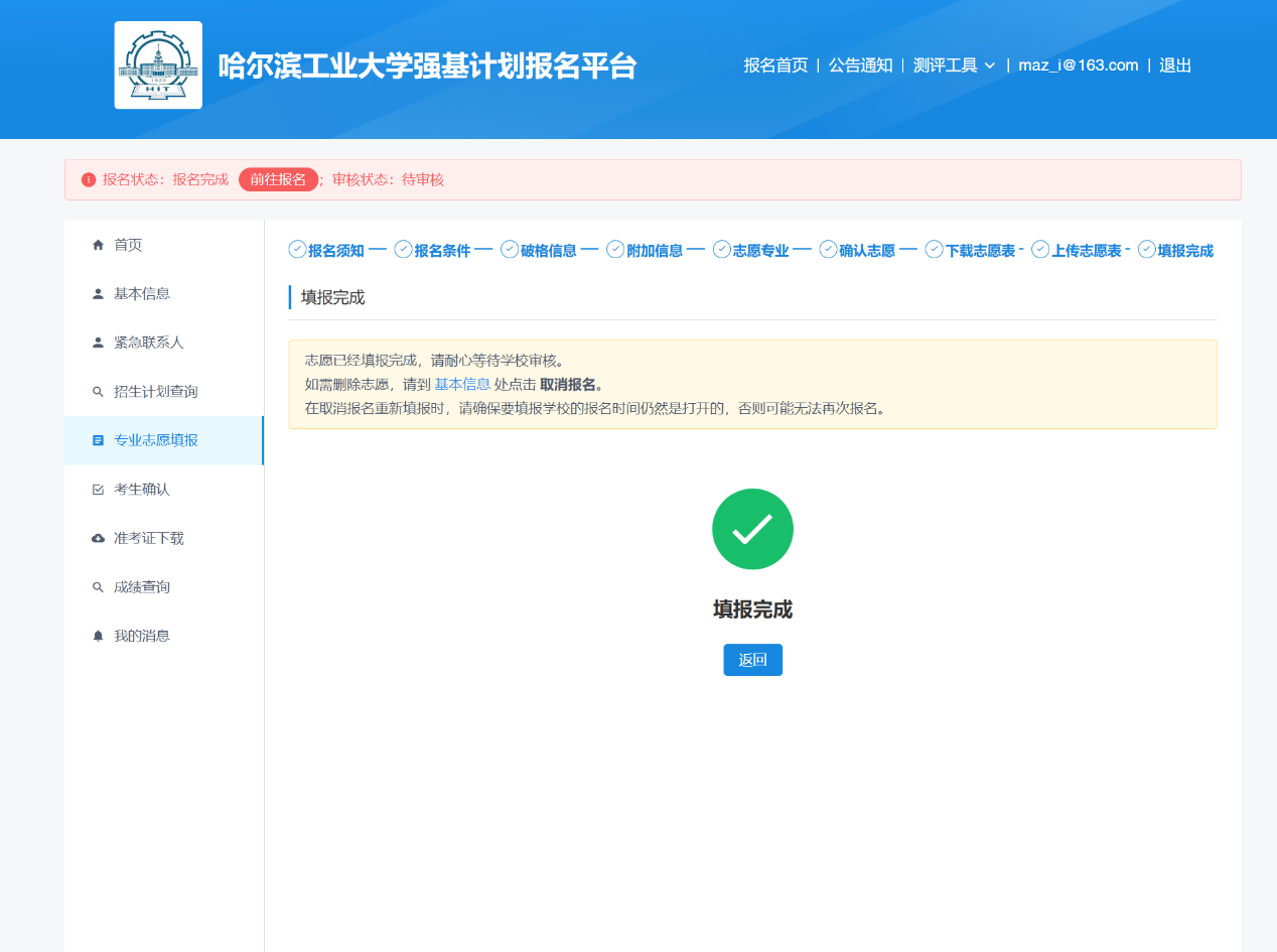 考生确认志愿后,系统中显示考生已经报名完成,此时考生已经完成我校强基计划的报名。系统中后续的进度并不是必须的,考生可直接退出系统。