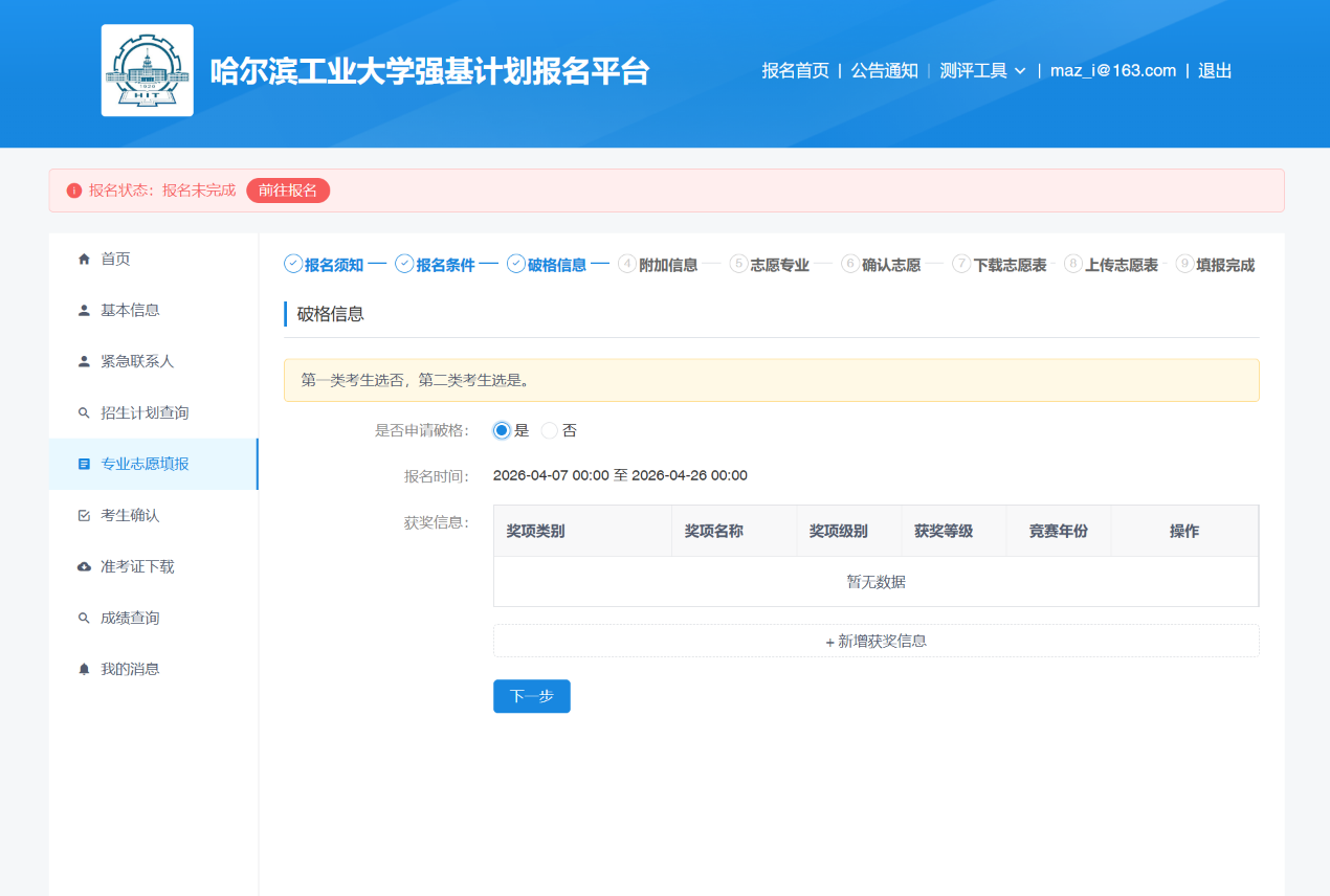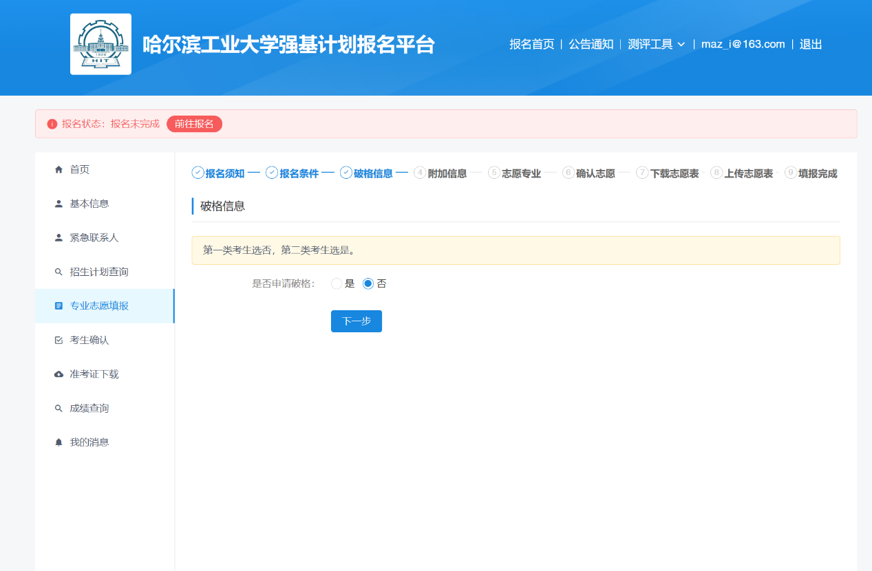 查阅招生计划后,点击左侧专业志愿填报,进入专业志愿填报页面:报名须知、报名条件、破格信息直至填报完成等进度显示。