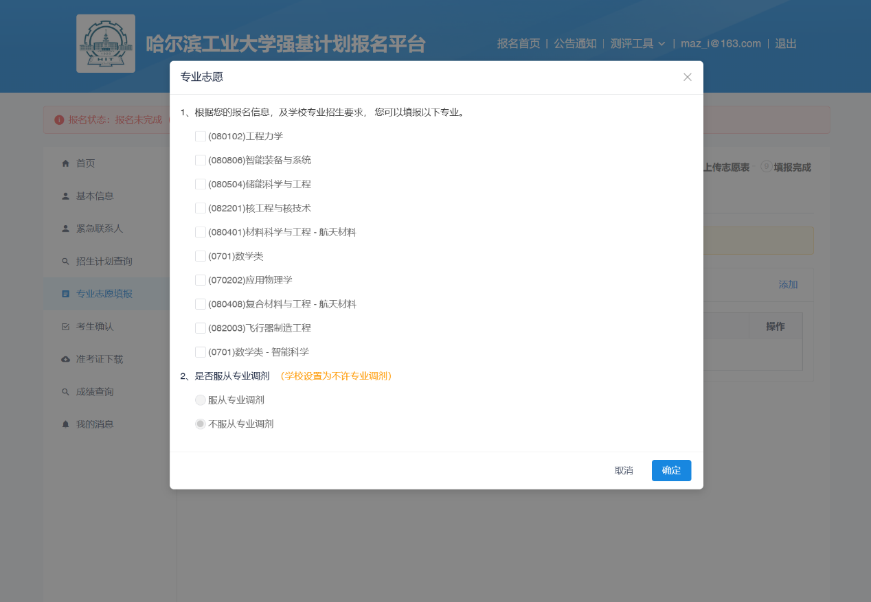 在弹出的专业选择页面中勾选自己的报考专业,我校强基计划入围过程中不调剂考生,系统显示为不允许调剂,考生也不能勾选是否服从调剂,点击确定即可。